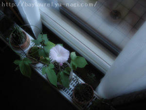 10月に入って咲き出したよ、ほんのり淡い色がついた朝顔。さすがに外に出すにはかわいそうな季節なので、家の中で。