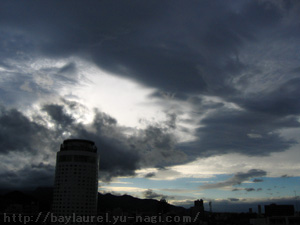土砂降りの雨の中、西の空に雲の切れ間が……。