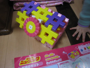 クリスマスプレゼントが届きました。 ちびっ子のばぁばからの贈り物。(笑) いつもショッピングモールのキッズコーナーで遊んでいたブロックが箱入りでやってきました。 もぅ、大喜び。 夢中で遊んでは 「こで、作って~」 攻撃。こんなもの作れます、の見本写真カタログが入っていたのね。 リクエストに応えて宝箱を組み立ててみました。面白い。大人もはまりそう。(笑) 宝箱の中からは何が見えるかな。ちびっ子視点の写真は面白いね。