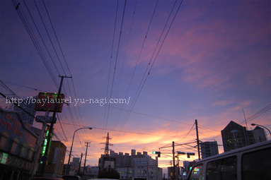 そんな道すがら、いつもと違う道で夕日と淡く流れる雲が目に止まりました。そういえば、昔々、この道は仕事の帰り道だったなぁ。夕日が濡れた道路に反射して、空も道も金色なの。キレイだよぉ。