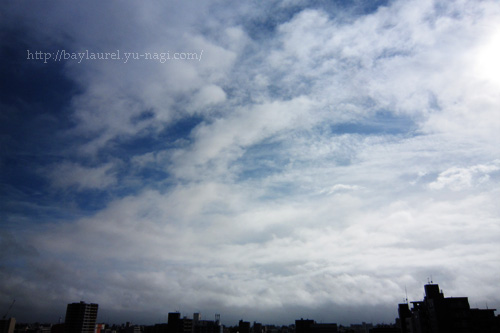 明け方、青空に雲が広がりだしていました。 次の大きな嵐が来るまでのつかのまの青空……なのかな。 昼少し前からまたぽつぽつ降り出してきたので、今日も外出できないね。 夕方、西の山に低い雲がかかっていました。 白龍が寝そべっているかのよう。 うん、天気図を見ても列島を覆うように寝そべっているよね。