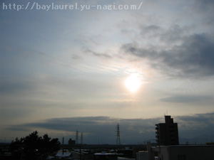 それで、さすがに職場でカメラ取り出して机の上を撮るわけにいかないので、しっかりカーテン漏れ日を堪能してから、ちょっとだけ外にでました。ところがこれまた、まぶしーよー。た、太陽の位置がわからん! だいたいこのへんかなぁ、と適当にシャッター押して今、パソコンに出してみたら、なんと彩雲が写ってました。めずらしー。