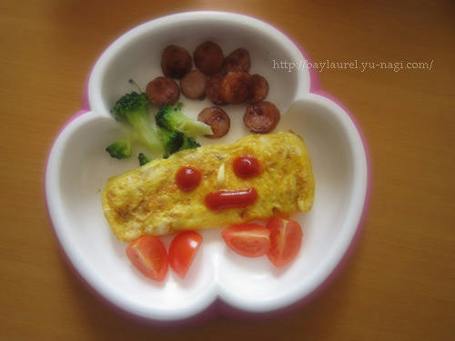 朝食はご飯と味噌汁と人面卵焼き。(笑) 食べ方はまんま顔面真ん中から齧りつき。もちろんおでこにケチャップ付けで。