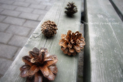 空の様子を伺いつつ、シャボン玉遊び……から、置いてあった松ぼっくりでお店屋さん。