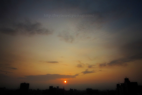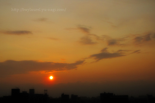 カーテンの隙間からピンク色の光が差し込んでいたので、朝日が昇ったのかなぁ~と窓の外を見てみると、ちょうど地平線の雲間から丸い姿が。
