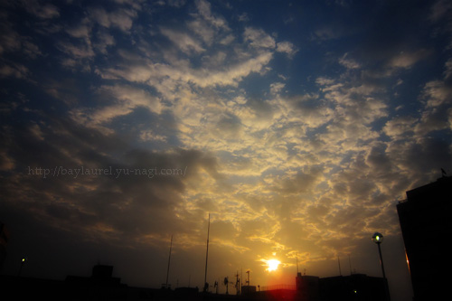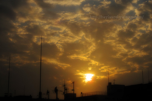 ここでUFOが浮かんでいたらムービーでも撮って投稿するところですが、紅い光の正体は、雲間から差し込んでいる朝日でした。(笑)