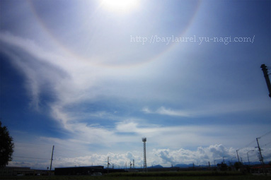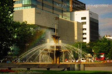 お弁当おむすびとスポーツドリンク持って、噴水の見える場所で。最初は雲が少しあったのだけれど、運がよければ見れるかなぁー、と思ったとおり虹が出ましたよ。わぁーい♪